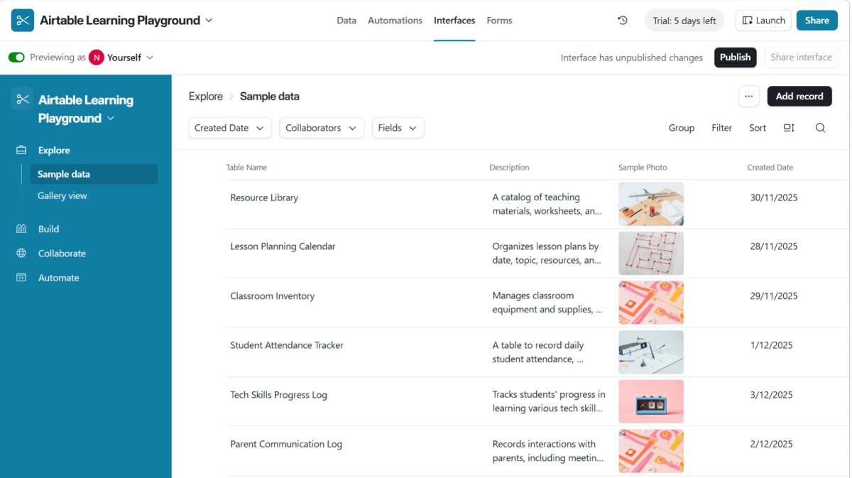 "Your "Airtable Learning Playground" app is designed to help you explore, organize, and automate sample data as you transition from teaching English to teaching tech." ~ Omni