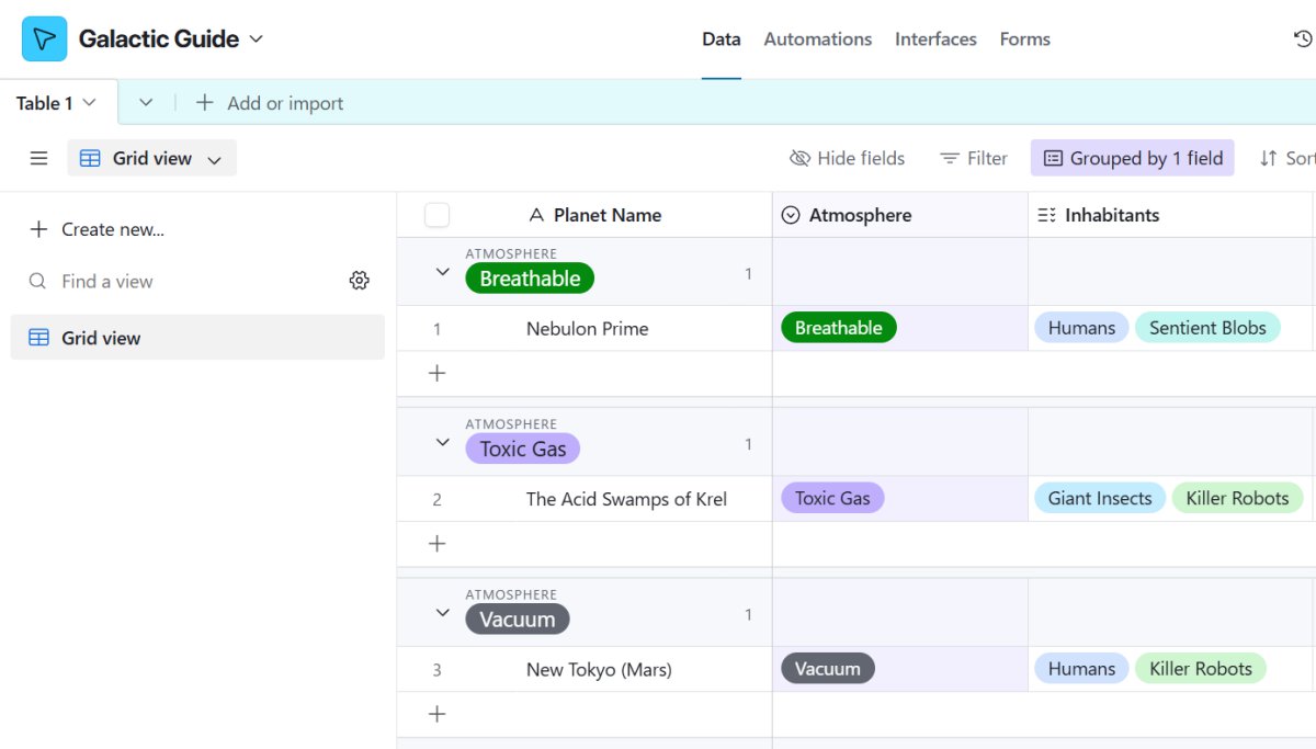 Besides the usefulness of the different select types, I really like how easy it is to assign colours in Airtable. After all, when navigating through an asteroid field, a quick glance at a colorful spreadsheet can be life-saving!