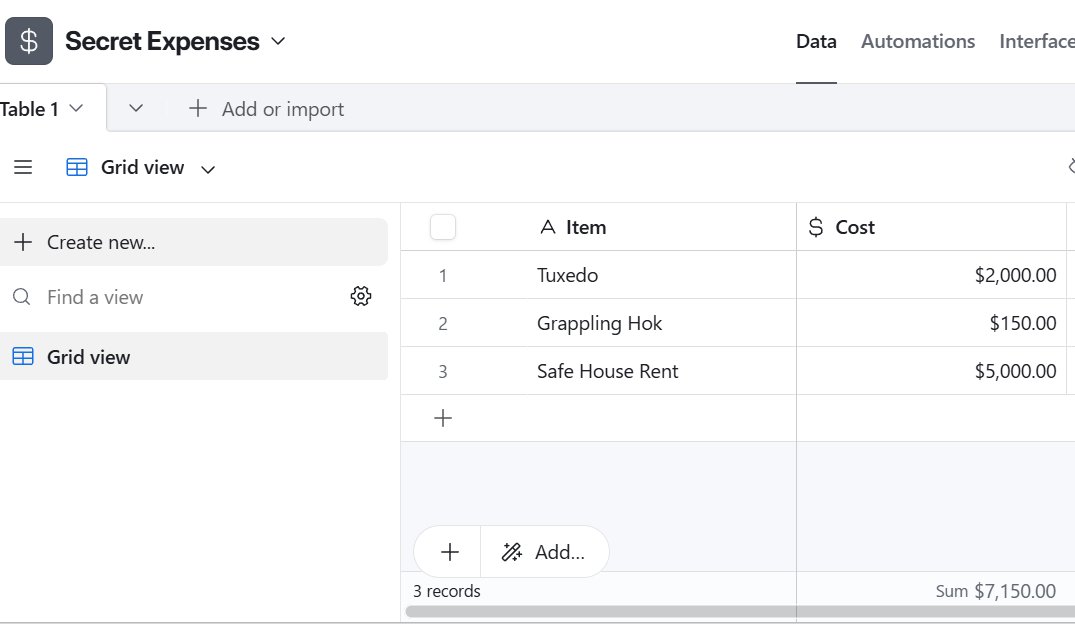 For the 6th of 10 Easy-Peasy Airtable Experiments I shifted from workflow management to basic financial tracking. I wanted to see how Airtable handles numbers and calculations compared to Excel. To test this, I set up a "Secret Expenses" base to track the costs of a double life.
